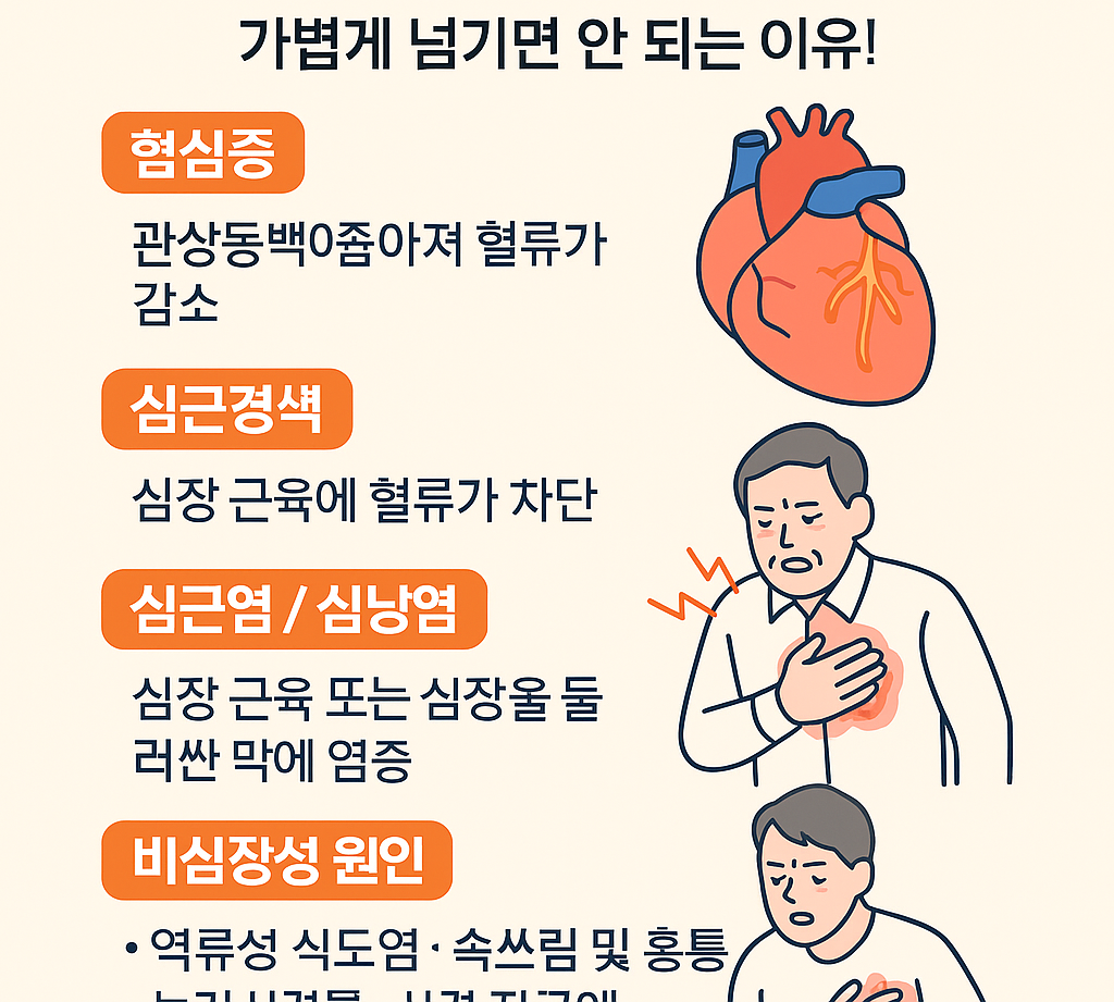 이러한 증상들이 반복되거나, 평소와 다른 형태의 통증이 나타난다면 반드시 심장 관련 원인을 의심해야 합니다.